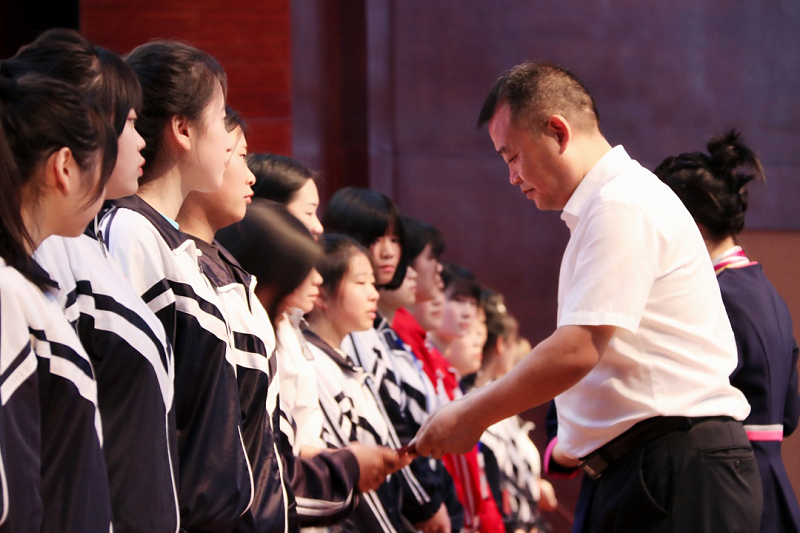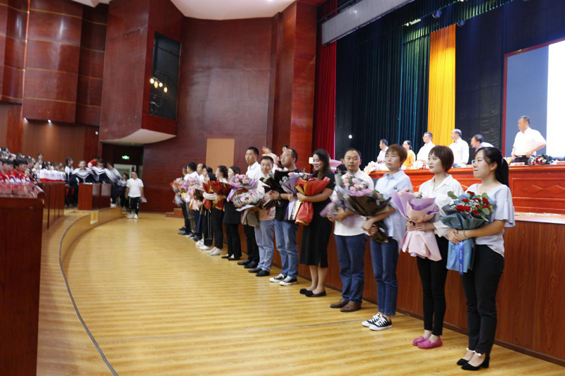 (學生向?qū)W校領(lǐng)導及畢業(yè)班班主任獻花)