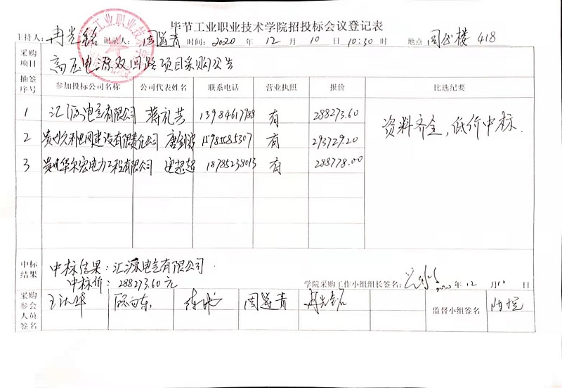 畢節(jié)工業(yè)職業(yè)技術(shù)學(xué)院高壓電源雙回路采購項目中標(biāo)公告