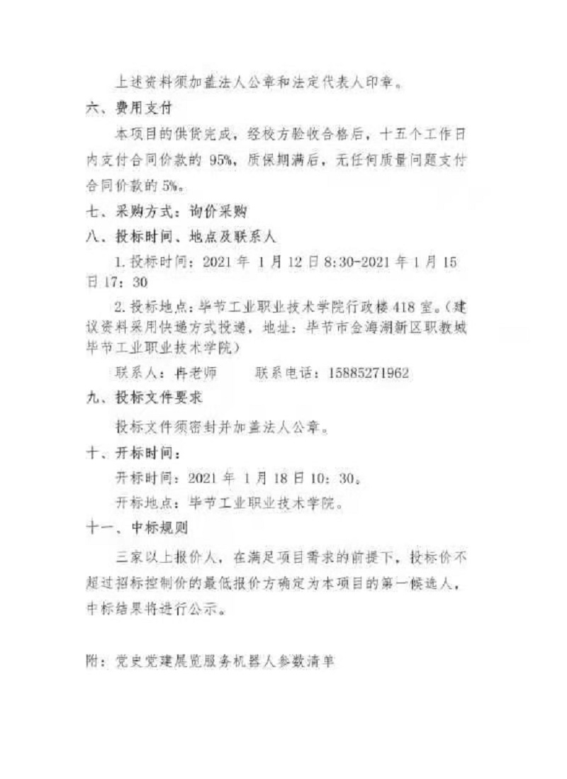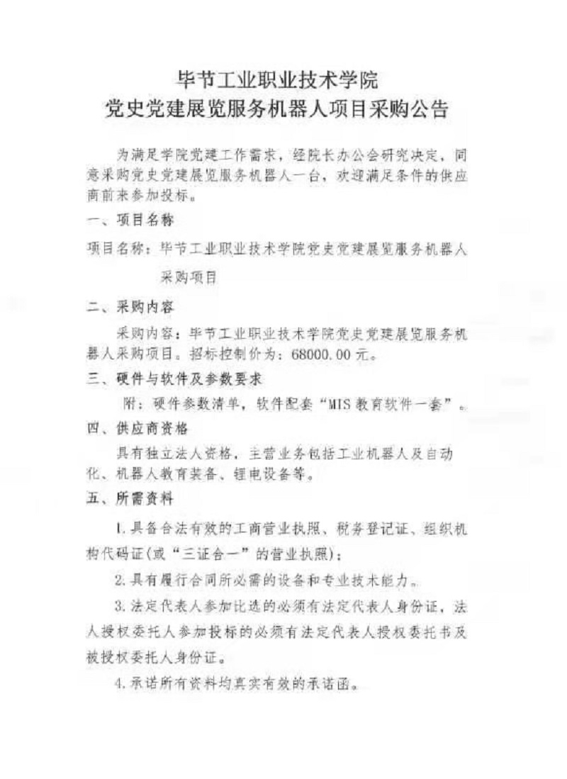 畢節(jié)工業(yè)職業(yè)技術(shù)學(xué)院黨史黨建展覽服務(wù)機(jī)器人項(xiàng)目采購(gòu)公告