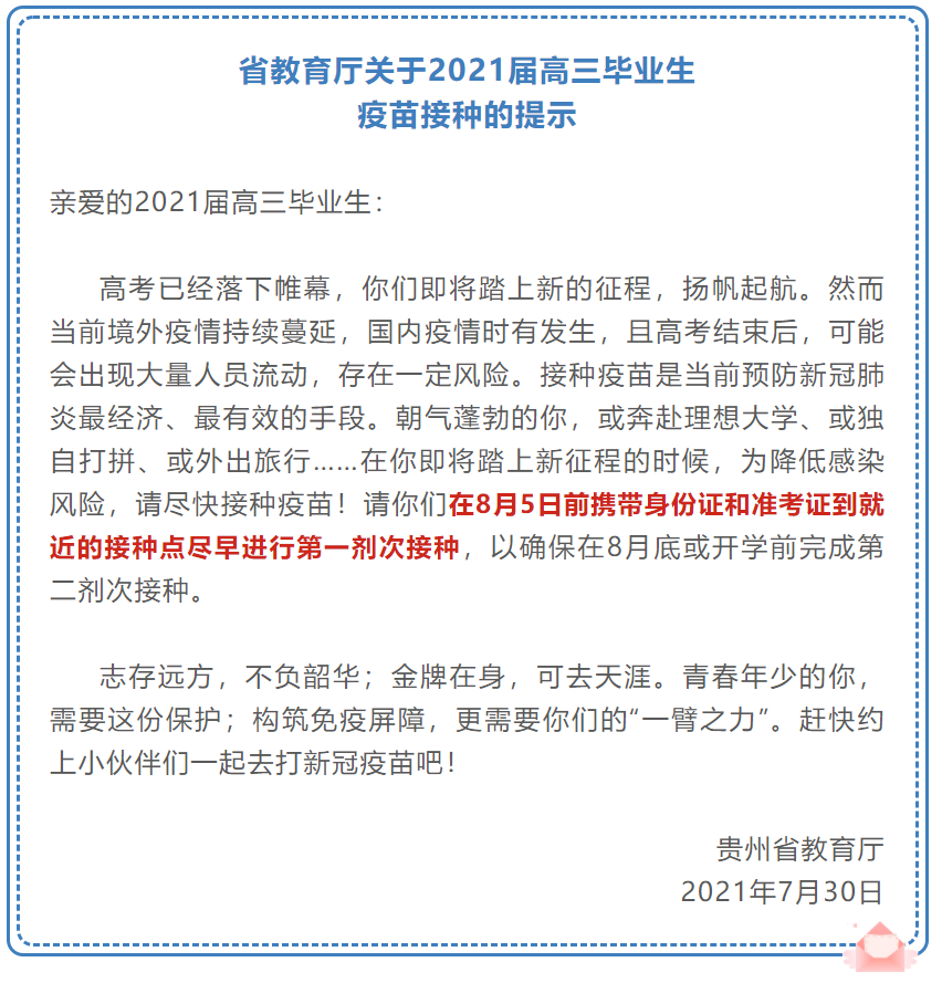 關(guān)于2021屆高三畢業(yè)生疫苗接種的提示