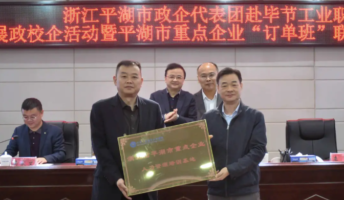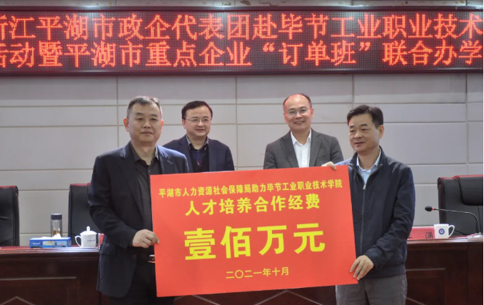 儀式上,浙江省平湖市委常委、常務(wù)副市長錢勇彪為畢節(jié)工業(yè)職業(yè)技術(shù)學(xué)院授“浙江省平湖市重點企業(yè)人力資源培訓(xùn)基地”牌,并贈予“人才培養(yǎng)合作經(jīng)費100萬元”。