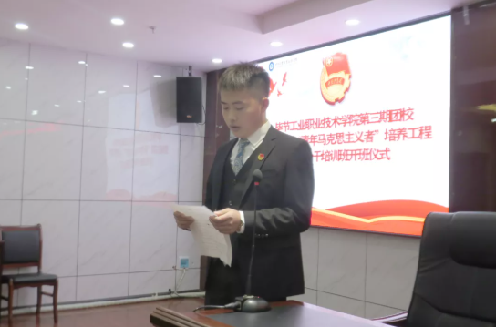 2021年12月16日畢節(jié)工業(yè)職業(yè)技術(shù)學(xué)院第三期團校暨第三期“青馬工程”培訓(xùn)班在同心樓九樓會議室舉行開班儀式。學(xué)院黨委委員、副院長黃文碧,黨委委員、組織部部長申開谷,各系部團總支負(fù)責(zé)人出席會議,院學(xué)生會主席團成員、入黨積極分子、團干、各系部優(yōu)秀學(xué)生代表共90余人參加開班儀式。開班儀式由團委負(fù)責(zé)人伍紹平主持。