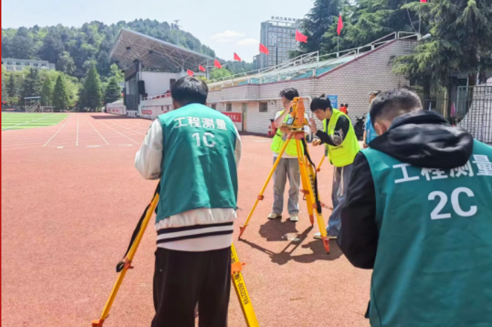 (靳海軍、李鳳老師指導(dǎo)的學(xué)生鄧密宏、吳磊、熊建發(fā)、張芳鑫在工程測(cè)量項(xiàng)目比賽現(xiàn)場(chǎng))