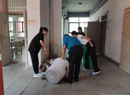 2021年9月2日中午,第三教學(xué)黨支部的黨員教師做好帶頭作用,親自清掃各樓層垃圾滿溢的垃圾桶,和學(xué)生一起到垃圾回收點(diǎn)倒垃圾。
