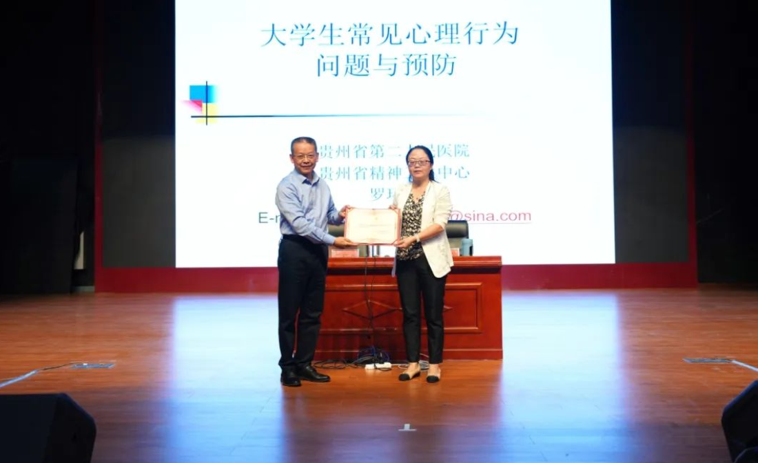 培訓(xùn)會(huì)上,羅環(huán)躍教授圍繞“大學(xué)生常見心理行為問題與預(yù)防”主題,從心理行為問題與精神疾病的區(qū)分、大學(xué)生常見心理行為問題、大學(xué)生心理問題的預(yù)防策略三個(gè)方面,對(duì)如何識(shí)別學(xué)生心理問題的正常與異常情況、學(xué)生常見心理行為問題及產(chǎn)生原因進(jìn)行分析,并就如何構(gòu)建良好家庭關(guān)系和朋輩關(guān)系,著力提升學(xué)生心理健康品質(zhì)等內(nèi)容進(jìn)行重點(diǎn)講解。通俗的語言,豐富的案例,理論與實(shí)踐的有效結(jié)合,現(xiàn)場(chǎng)學(xué)生個(gè)案問題處理的交流與互動(dòng),幫助參訓(xùn)教師了解了學(xué)生心理健康知識(shí),提升了服務(wù)學(xué)生心理健康的水平和能力。 會(huì)后,黃文碧代表學(xué)院為羅環(huán)躍頒發(fā)了畢節(jié)工職院心理學(xué)客座教授聘書。