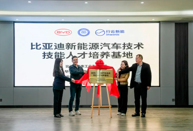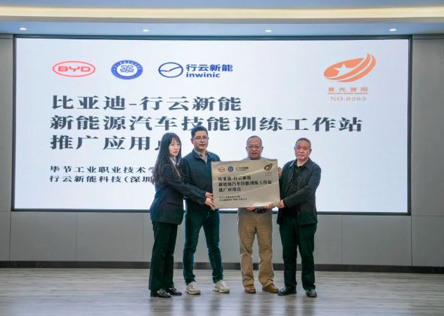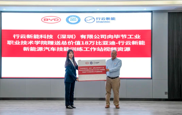(會議現(xiàn)場) 會上,邱國援介紹了畢節(jié)工業(yè)職業(yè)技術學院發(fā)展現(xiàn)狀、辦學特色、辦學理念等情況,并指出希望通過發(fā)揮企業(yè)的市場、技術、設備等方面優(yōu)勢,共建人才培養(yǎng)基地,為學院相關專業(yè)學生提供優(yōu)質技能學習條件,進一步推動校企合作,深化產教融合,實施人才精準培養(yǎng)、企業(yè)精準招聘,促進人才鏈與產業(yè)鏈無縫銜接,探索校企合作辦學模式與運行機制,創(chuàng)新技術技能人才培養(yǎng)體系,豐富職業(yè)教育內涵建設,進一步發(fā)揮職業(yè)教育優(yōu)勢服務社會、行業(yè)、企業(yè)。 蔣平指出,希望與畢節(jié)工業(yè)職業(yè)技術學院在“產、學、訓”等方面密切合作,創(chuàng)新人才培養(yǎng)模式,共同培養(yǎng)更多高素質、高技能的應用型人才,促進共同發(fā)展。 王克靜指出,將在下一步的合作中提供全產業(yè)鏈人才培養(yǎng)生態(tài)系統(tǒng)服務整體解決方案,與學院、比亞迪共同開發(fā)課程與教材,優(yōu)化課程體系,搭建“產、學、研”服務平臺,推動人才培養(yǎng)模式改革、管理體制機制創(chuàng)新,助力培養(yǎng)企業(yè)所需的高素質技能人才。 (簽約儀式) 基地投入使用后,校企雙方將共同制定人才培養(yǎng)方案,通過企業(yè)工程師入校教學、教師定崗實習培訓,實現(xiàn)教師技術技能和教學能力雙提升,利用行業(yè)標準和企業(yè)、社會資源提高專業(yè)建設標準,打造高質量行業(yè)人才培養(yǎng)體系,切實提升我院人才培養(yǎng)質量和水平。 (揭牌儀式) (授牌儀式) 會上,畢節(jié)工業(yè)職業(yè)技術學院還與比亞迪汽車股份有限公司、行云新能科技(深圳)有限公司舉行了簽約、揭牌、授牌儀式及新能源技術技能工作站捐贈儀式。 (捐贈儀式)
