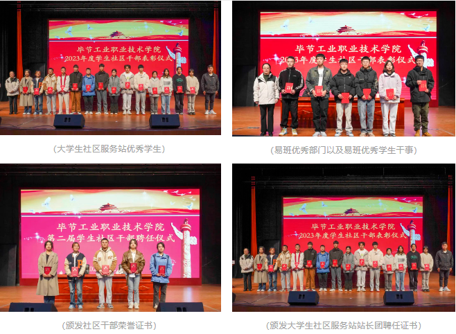 12月6日,畢節(jié)工業(yè)職業(yè)技術(shù)學(xué)院“一站式”學(xué)生社區(qū)干部表彰及聘任儀式在多功能廳召開(kāi)。學(xué)院黨委委員、副院長(zhǎng)黃文碧出席儀式并為受表彰和聘任的同學(xué)頒獎(jiǎng),學(xué)生工作處負(fù)責(zé)人胡永祚主持會(huì)議并為大學(xué)生社區(qū)服務(wù)站優(yōu)秀學(xué)生頒發(fā)榮譽(yù)證書(shū)。學(xué)院相關(guān)部門主要負(fù)責(zé)人,社區(qū)管理委員會(huì)、易班工作及系部師生代表800余人參加儀式。