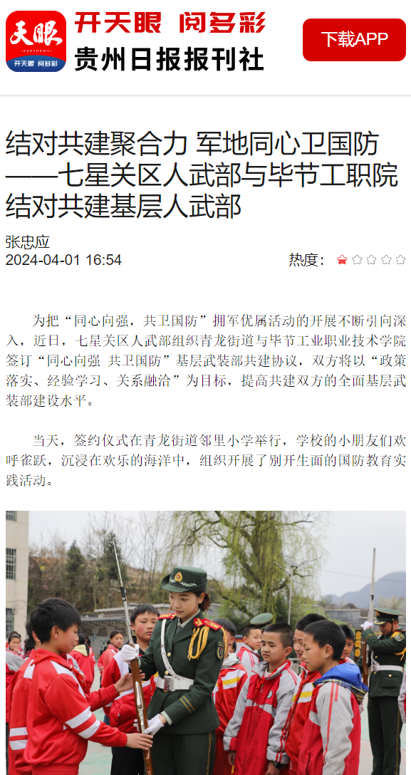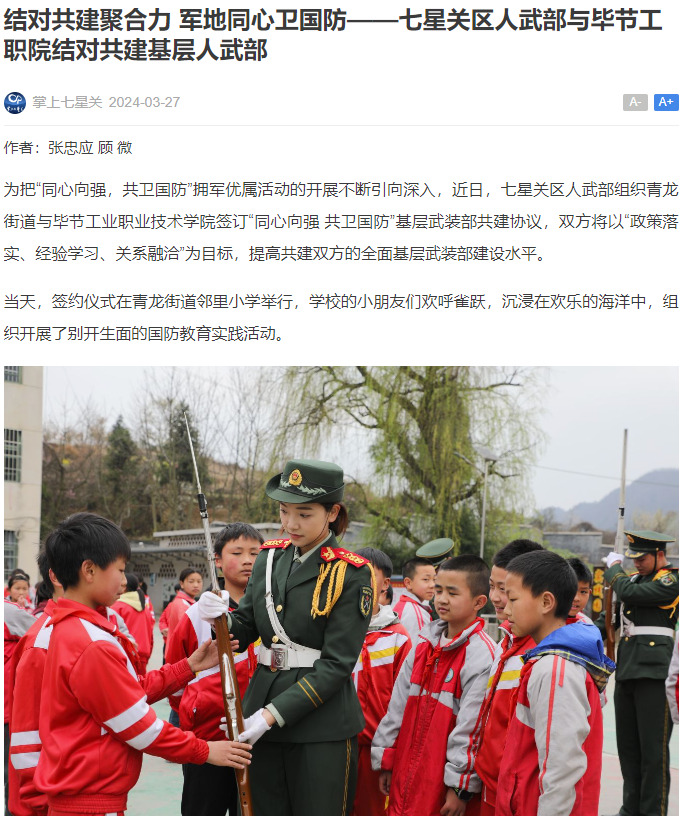 4月2日,貴州省畢節(jié)市七星關(guān)區(qū)人武部組織畢節(jié)工業(yè)職業(yè)技術(shù)學(xué)院與青龍街道簽訂“同心向強共衛(wèi)國防”基層武裝部共建協(xié)議,并共同開展了以“清明祭英烈同心衛(wèi)國防”為主題的清明祭英烈系列活動。該做法被人民融媒體、天眼新聞、掌上七星關(guān)等多家媒體報道。