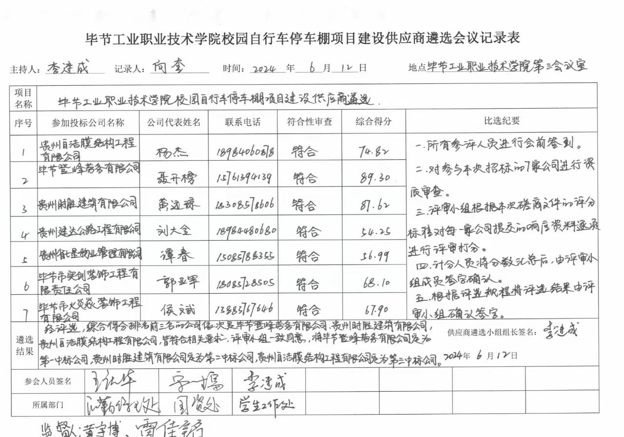 畢節(jié)工業(yè)職業(yè)技術(shù)學(xué)院校園自行車停車棚項(xiàng)目建設(shè)供應(yīng)商遴選結(jié)果公示
