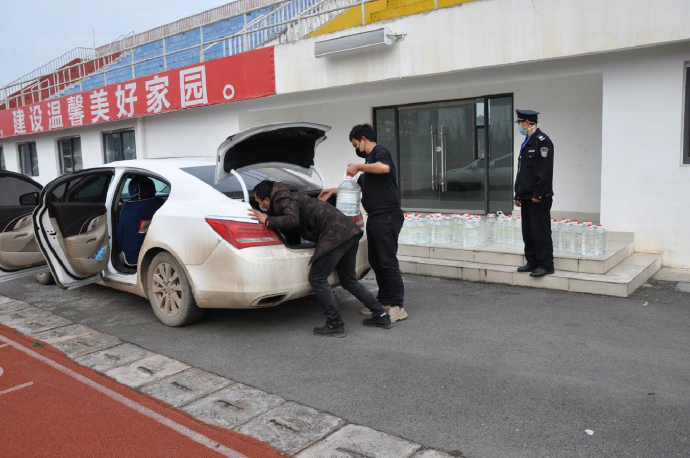 (脫貧攻堅幫扶點(diǎn)工作人員到存放處領(lǐng)取學(xué)院捐贈醫(yī)用消毒酒精)