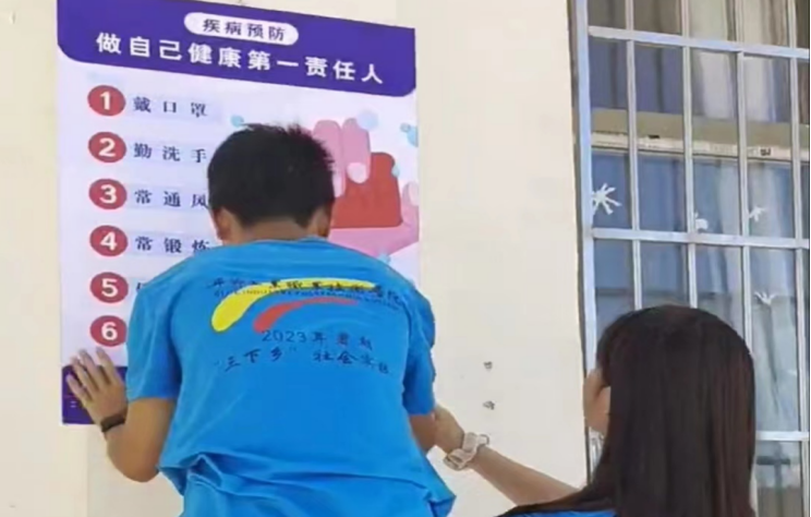 圖為實踐隊員張貼健康海報