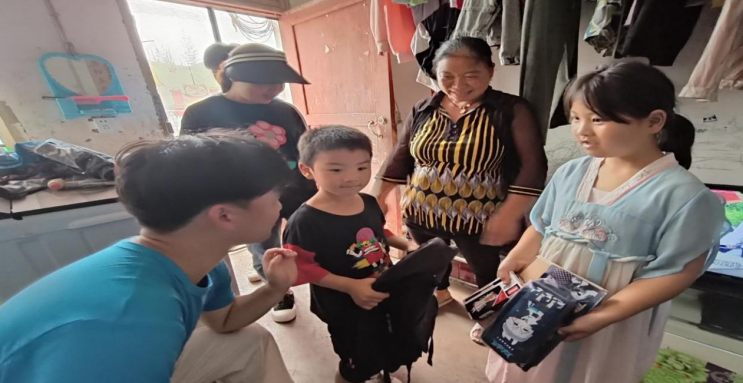 圖為實踐隊成員給留守兒童送上書包及學(xué)習(xí)用品