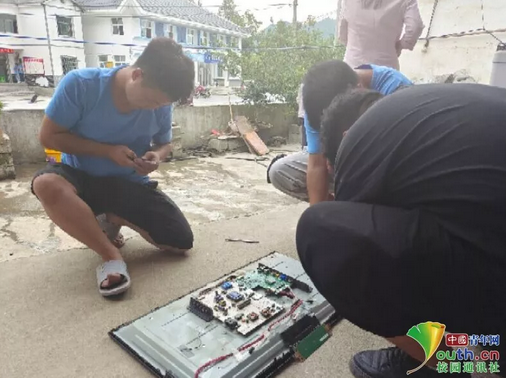 ▲志愿者幫助村民檢查液晶電視故障并維修