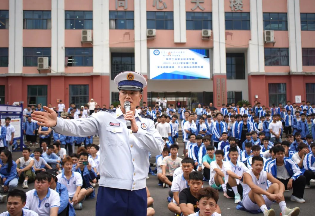 演練中,學生代表還實地體驗了使用消防救生梯逃生的應急處置流程,直觀地體驗面對危險時的正確自救方法以及冷靜有序的撤離。 演練結束后,消防員給學生普及了消防知識,金海湖消防大隊隊長朱海以真實案例將消防安全知識深入淺出地進行講解,介紹了校園常見火災發(fā)生的原因及防范措施,講解了使用滅火器撲救初期火災方法。 朱海在總結演練過程時指出,整個演練安全、高效、有序,達到了預期目標,取得了明顯的成效,檢驗了學院的消防工作。他要求,全體師生要牢固樹立安全防范意識,熟練掌握防踩踏規(guī)范動作,學會自我保護的方法,確保在發(fā)生突發(fā)情況時應急工作能快速、高效、有序地進行,從而最大限度地保護全體師生的生命安全,減少不必要的傷害。 學院黨委委員、副院長黃河結合校園安全工作實際情況,提出三點要求:一是要求廣大師生牢固樹立“安全第一、生命至上”的理念,強化安全紅線意識,在思想上繃緊安全這根弦;二是要求廣大師生認真對待,珍惜這次全疏散演練、滅火演練及消防科普活動的機會,掌握在緊急情況下迅速逃生、自救、互救的基本技能,提高應對火災突發(fā)應對能力;三是要求相關職能部門要堅持強化安全防范,堅持把校園安全隱患排查整治作為一項重要工作常抓不懈、警鐘長鳴,真正做到防患于未然,有效預防和堅決遏制安全事故的發(fā)生。