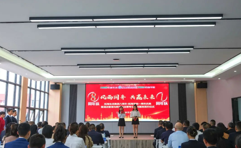 5月12日,畢節(jié)工業(yè)職業(yè)技術(shù)學(xué)院拓海學(xué)院一周年成立儀式暨畢節(jié)工業(yè)職業(yè)技術(shù)學(xué)院酒店管理與數(shù)字化運(yùn)營專業(yè)實(shí)訓(xùn)基地簽約儀式在拓海學(xué)院會(huì)議室舉行。學(xué)院黨委副書記、院長邱國援,黨委委員、副院長黃瑛、黃河、吳家文、黃文碧,拓海學(xué)院名譽(yù)院長、拓海生活集團(tuán)總裁楊月強(qiáng),拓海學(xué)院院長林彬出席儀式,拓海集團(tuán)相關(guān)領(lǐng)導(dǎo)、員工代表及學(xué)院社會(huì)服務(wù)系師生代表參加儀式。 儀式現(xiàn)場 邱國援在致辭中指出,校企雙方共建拓海學(xué)院實(shí)訓(xùn)基地,為相關(guān)專業(yè)學(xué)生提供了理實(shí)一體化教學(xué)場地和實(shí)習(xí)實(shí)訓(xùn)平臺(tái),改善了物業(yè)管理、酒店管理等專業(yè)的教學(xué)、實(shí)訓(xùn)條件,使我院辦學(xué)條件、人才培養(yǎng)體系和教學(xué)質(zhì)量得到不斷提高。同時(shí),拓海集團(tuán)積極參與物業(yè)管理專業(yè)人才培養(yǎng)方案修訂,從行業(yè)、企業(yè)角度提出了很多人才培養(yǎng)的意見建議,邀請行業(yè)專家來校講學(xué),親自授課,使學(xué)生專業(yè)知識得到有力提升,使物業(yè)管理專業(yè)人才培養(yǎng)體系更加符合行業(yè)需求。下一步,希望校企雙方繼續(xù)深化校企合作機(jī)制、持續(xù)擴(kuò)大合作范圍、協(xié)同提升合作質(zhì)量,充分發(fā)揮拓海生活服務(wù)集團(tuán)在物業(yè)管理方面的專業(yè)優(yōu)勢,在人才培養(yǎng)方案、課程教學(xué)、實(shí)習(xí)實(shí)訓(xùn)、教師培養(yǎng)等方面提供企業(yè)建議和技術(shù)指導(dǎo),在教育教學(xué)、學(xué)生管理、素質(zhì)培養(yǎng)、技能提升等方面與學(xué)院交換經(jīng)驗(yàn),提升教師專業(yè)素質(zhì),強(qiáng)化學(xué)生技能提升,推進(jìn)“工學(xué)結(jié)合”教學(xué)模式,共同提高學(xué)院育人質(zhì)量。 邱國援在儀式上致辭 楊月強(qiáng)表示,過去一年,校企雙方本著優(yōu)勢互補(bǔ)、資源共享、互惠雙贏、共同發(fā)展的原則,對校企合作模式進(jìn)行了深層次的探索、創(chuàng)新與實(shí)踐,拓海學(xué)院的成立不僅推動(dòng)了產(chǎn)教融合,也為學(xué)生提供了優(yōu)質(zhì)的實(shí)訓(xùn)基地,為企業(yè)提供了強(qiáng)有力的人才保障。下一步,企業(yè)將繼續(xù)聯(lián)手學(xué)院不斷創(chuàng)新,共同培養(yǎng)高素質(zhì)技術(shù)技能型人才,構(gòu)建校企合作雙贏局面,助推職業(yè)教育改革和地方經(jīng)濟(jì)社會(huì)高質(zhì)量發(fā)展。 楊月強(qiáng)在儀式上講話 儀式上,邱國援代表學(xué)院與拓海生活集團(tuán)簽訂了《畢節(jié)工業(yè)職業(yè)技術(shù)學(xué)院酒店管理與數(shù)字化運(yùn)營專業(yè)實(shí)訓(xùn)基地(中心)建設(shè)合作協(xié)議》。學(xué)院與拓海生活集團(tuán)將再次攜手,共建畢節(jié)工業(yè)職業(yè)技術(shù)學(xué)院酒店管理與數(shù)字化運(yùn)營專業(yè)實(shí)訓(xùn)基地,共同承擔(dān)科研項(xiàng)目、實(shí)現(xiàn)信息共享,培養(yǎng)更多高質(zhì)量的技能人才,為畢節(jié)全面推進(jìn)鄉(xiāng)村振興提供有力的人才支撐。 簽約儀式現(xiàn)場 拓海學(xué)院院長林斌、社會(huì)服務(wù)系主任呂振欣為優(yōu)秀學(xué)生羅達(dá)麗、李定奎頒發(fā)榮譽(yù)證書 優(yōu)秀學(xué)生代表羅達(dá)麗發(fā)言 儀式中的精彩節(jié)目