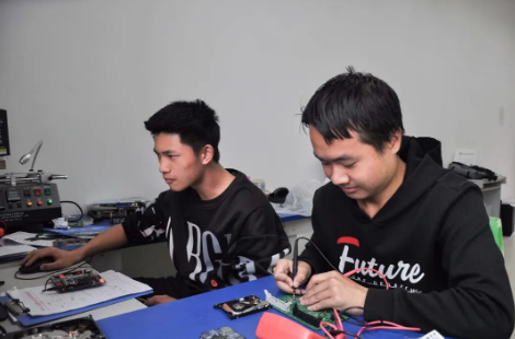 (邱家駒(左)高祥盛(右)在實訓室認真?zhèn)滟悾?/span>